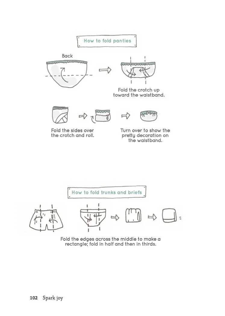 Follow Marie Kondo’s Spark Joy book illustrations (a few examples below), watch her YouTube videos or check out my folding demos on instagram